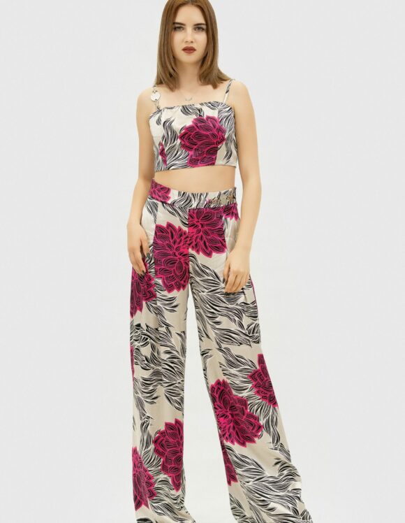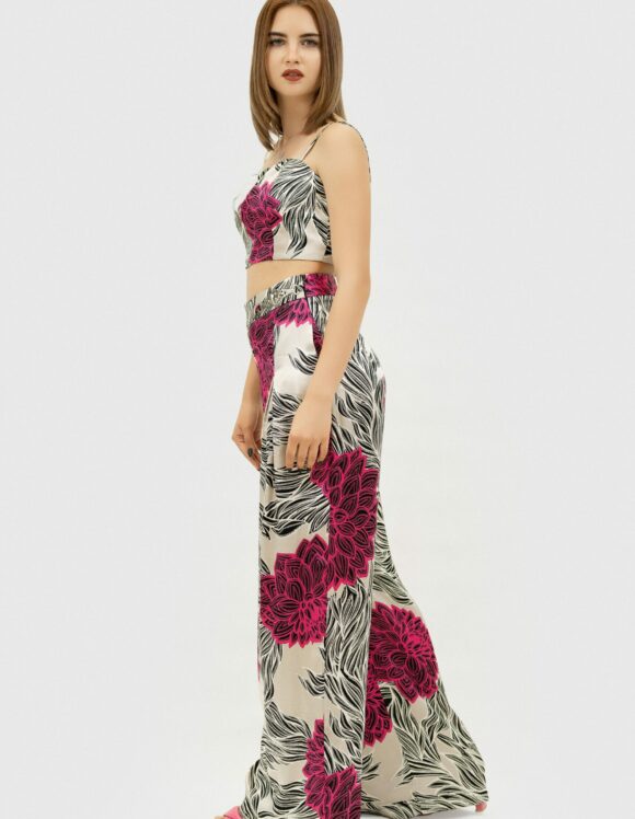 Костюм-двойка FAVORI Стиль: Коктейльный Состав: 100% polyester Длина топа: 23 см Длина брюк: 112 см Сезон: весна-лето Цвет: бежевый Узор: анималистичный принт и цветы Застежка: топ и брюки на молнии Страна производства: Турция Артикул: 25181