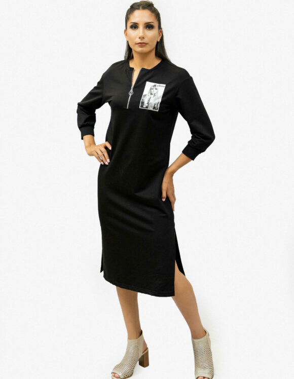 Платье: Бренд MOY MIR Стиль: Кэжуал, спорт-шик Состав: 62% Polyester 33% Viscose 5% Elastan Размер товара на модели: 36 EUR Параметры модели: 85-62-89 Рост модели на фото: 170 Подходит на рост: 165-175 Длина: 112 см Длина рукава: 47 см Сезон: Весна-лето-осень Цвет: Черный Узор: Однотонный с портретом девушки на накладном