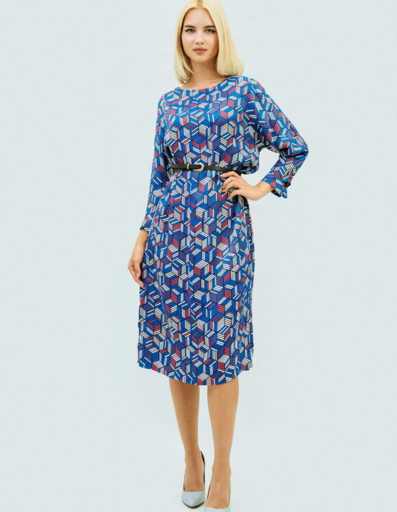 Платье PIENA Стиль: Кэжуал, полуклассика Состав: 100% viscon Длина: 106 см Длина рукава: 46 см Сезон: демисезонный Цвет: синий Узор: геометрический узор Застежка: сбоку на молнии, сзади на пуговице Страна производства: Турция Артикул: 23PK6340