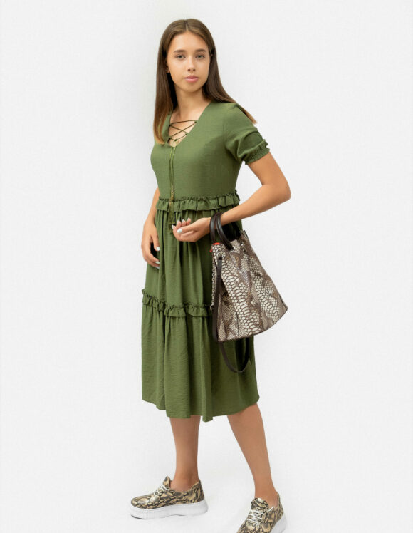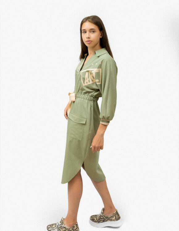 Платье: Бренд ANIMA Стиль: Кэжуал Состав : 65% Polyester,35% Viscon Размер товара на модели: 36 EUR Параметры модели: 85-62-89 Рост модели на фото: 170 Подходит на рост: 165-175 Длина: 114 см Длина рукавов: 25 см Сезон: Лето Цвет: Хаки Узор: Однотонный Гарантийный период: не установлен Страна производства: Турция Застежка: Спереди