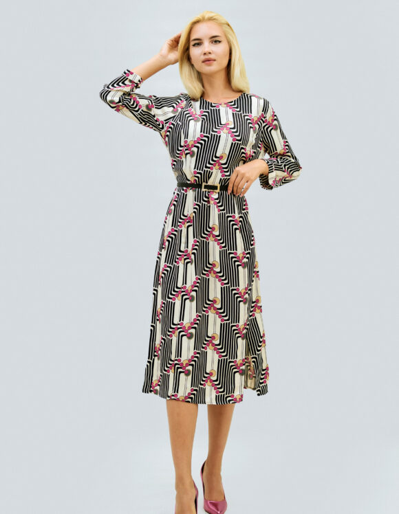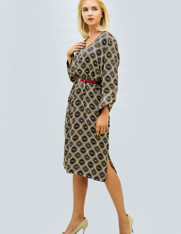 Платье PIENA Стиль: Кэжуал Состав: 100% viscon Длина: 116 см Длина рукава: 48 см Сезон: демисезонный Цвет: бежевый Узор: геометрические фигуры Застежка: молния Страна производства: Турция Артикул: 23PK6313