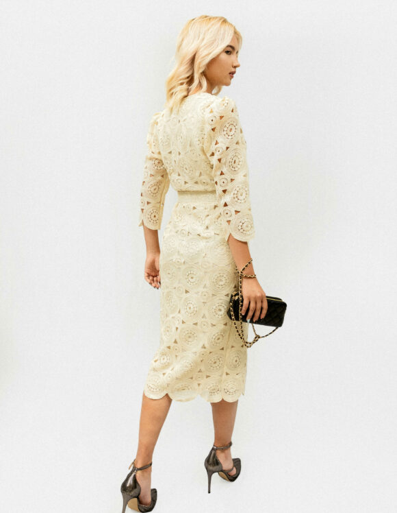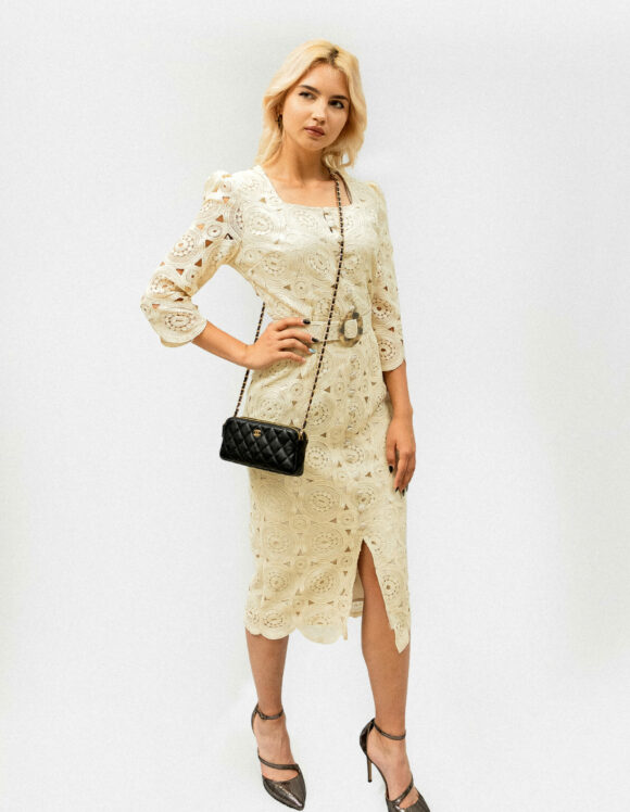 Платье:Бренд Lilium Стиль:Классика Состав:100% Полиэстер Размер товара на модели: 36 EUR Параметры модели: 85-62-89 Рост модели на фото: 170 Подходит на рост: 165-175 Длина: 115 см Размер рукав : 49 см Сезон: Демисезонная Цвет: Бежевый Узор: Однотонное,Плетенье кроше! Гарантийный период: не установлен Страна производства: Турция Застежка: спереди на пуговицах с