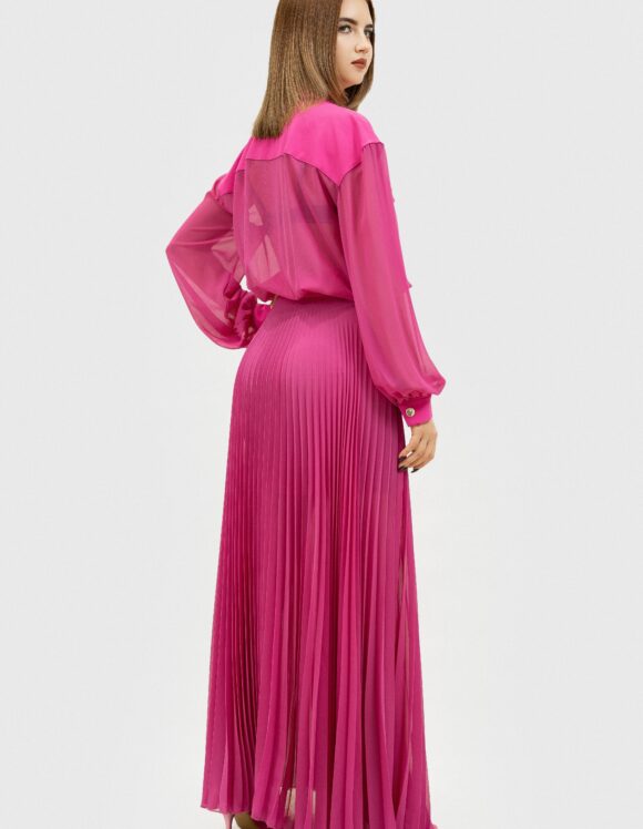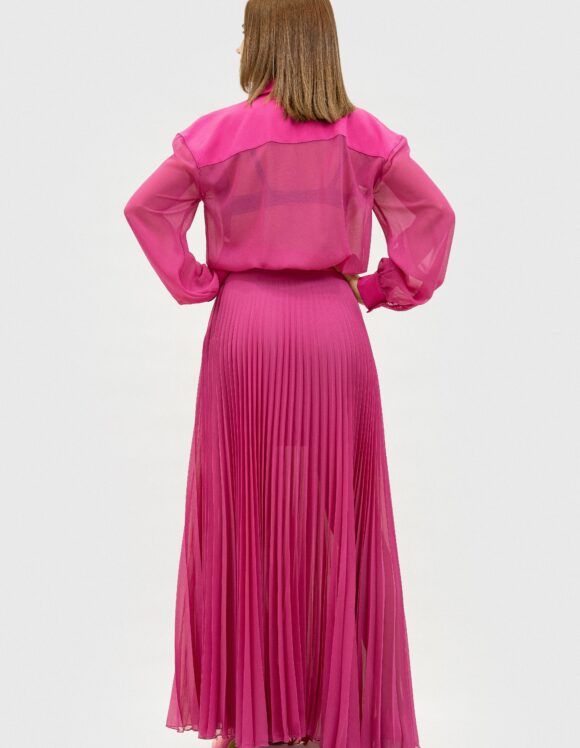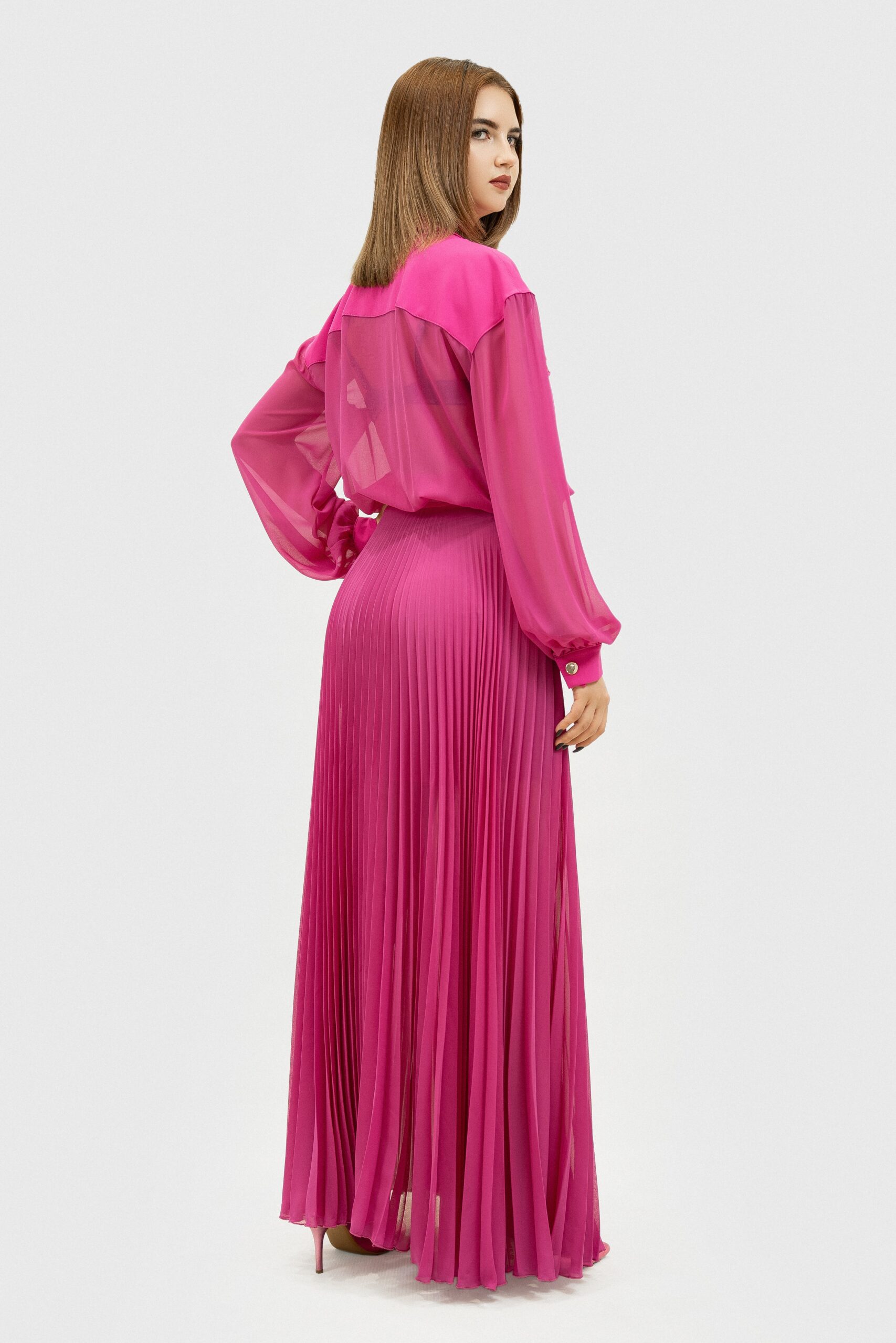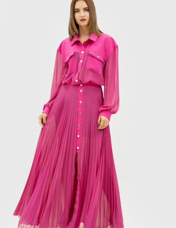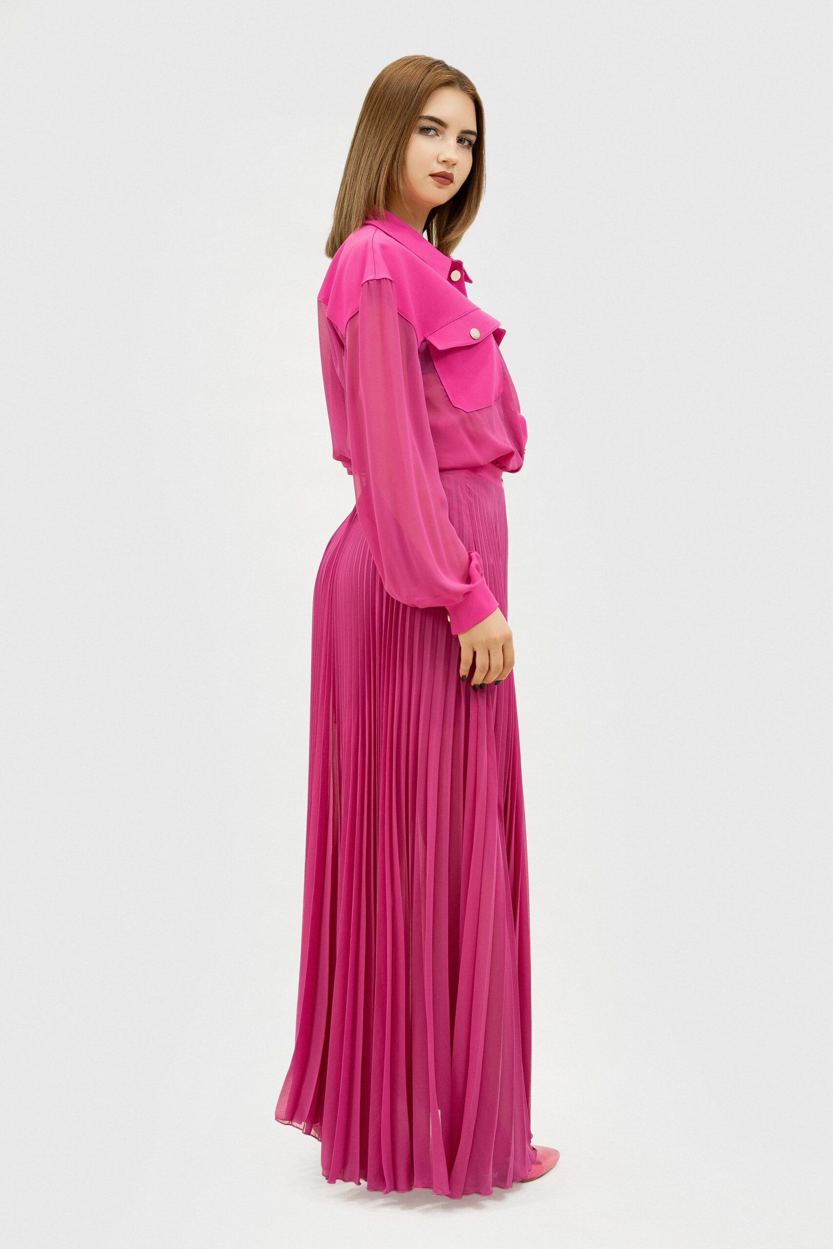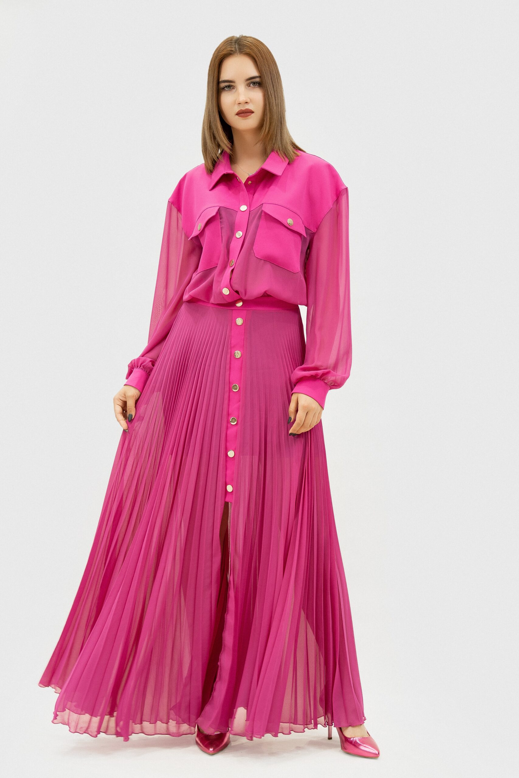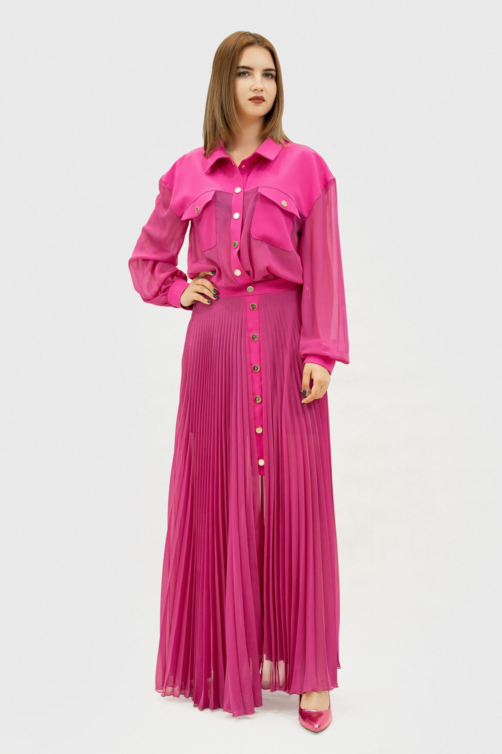 Костюм-двойка VANITA Стиль: Lady fit Состав: 70% viscose, 30% polyester Длина блузки: 50 см Длина рукавов: 59 см Длина юбки: 109 см Сезон: весна-лето Цвет: фуксия Узор: однотонный Застежка: блузка на пуговицах, юбка на молнии Страна производства: Турция Артикул: 7234