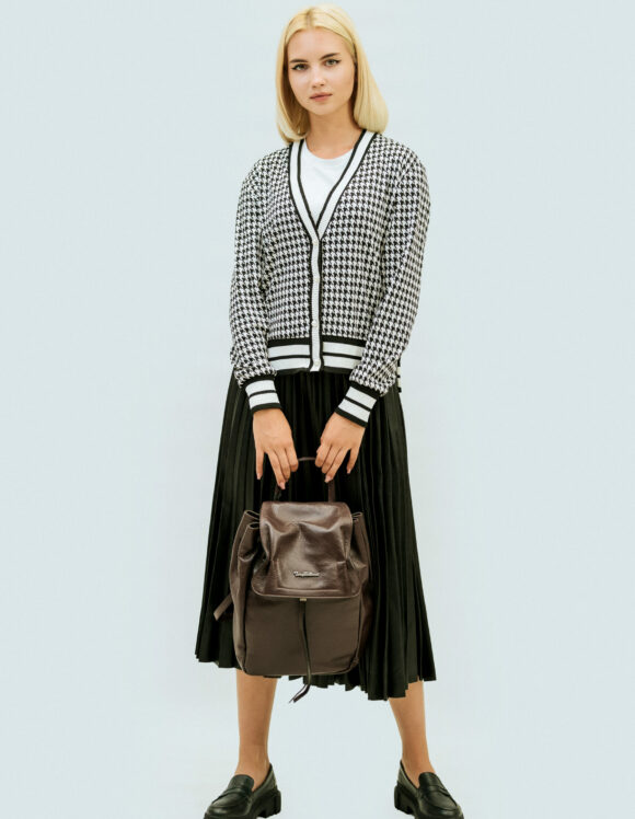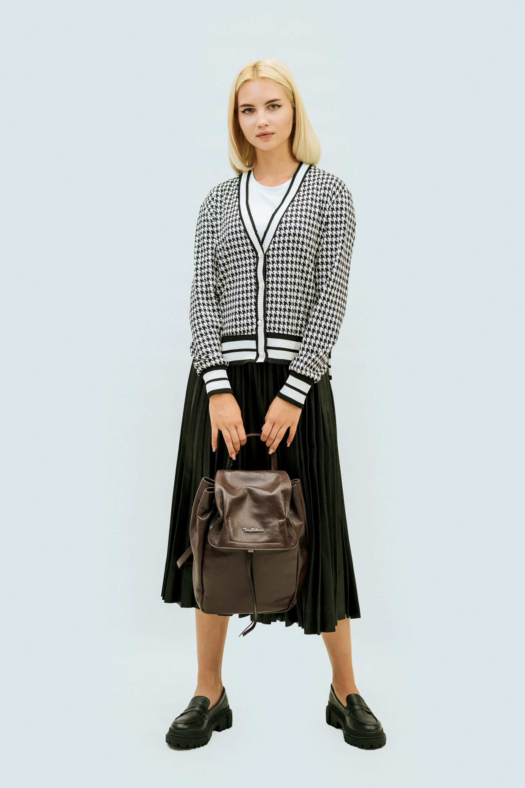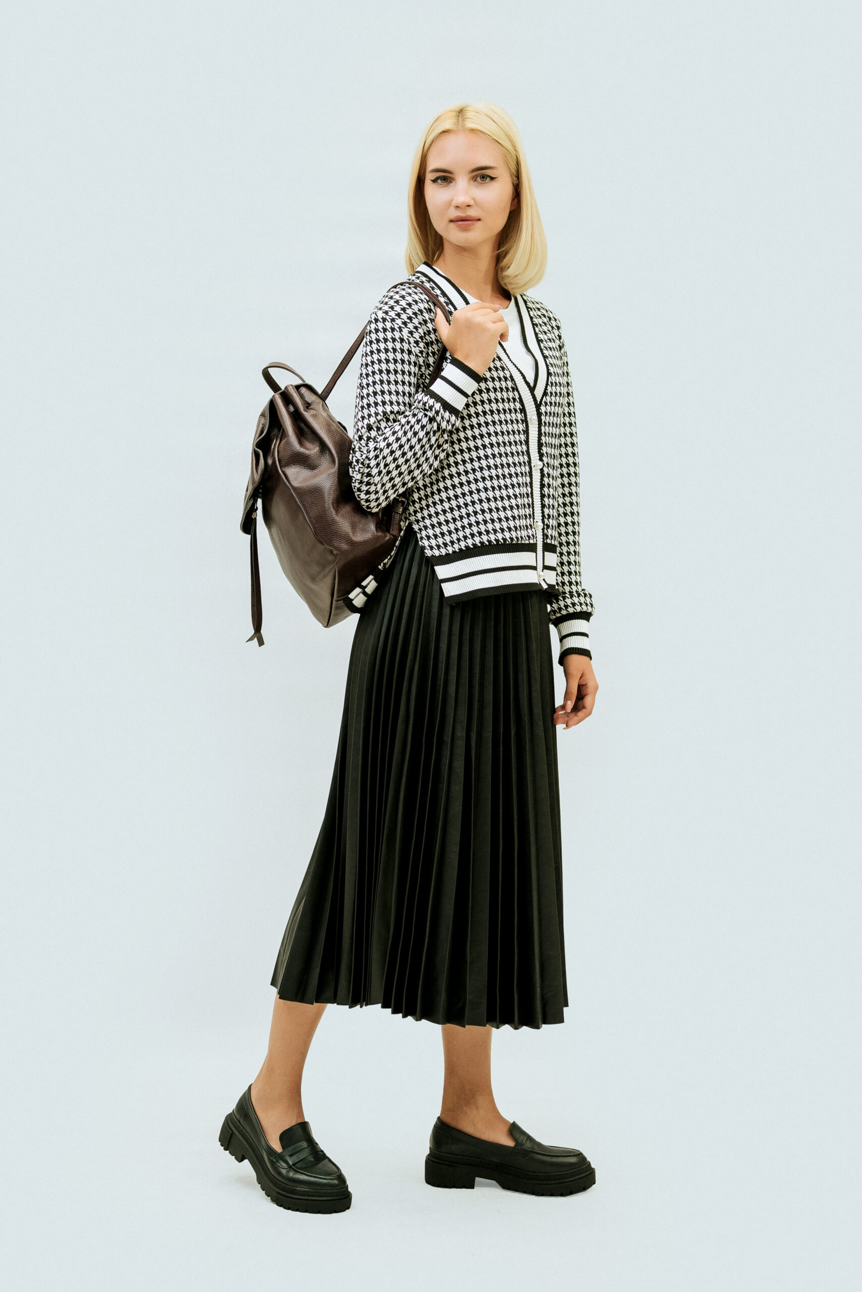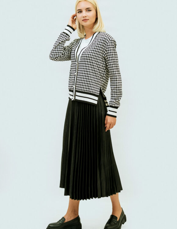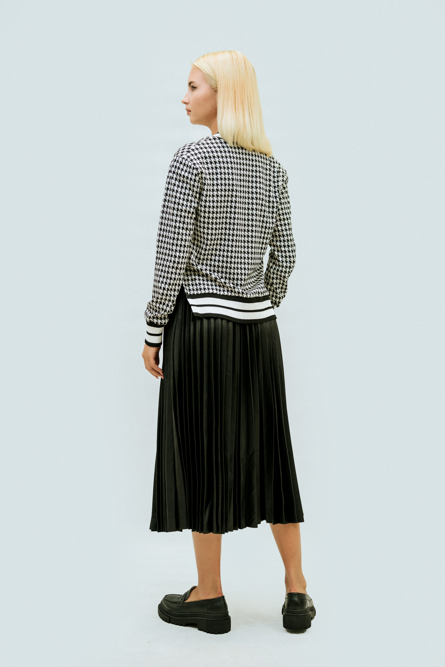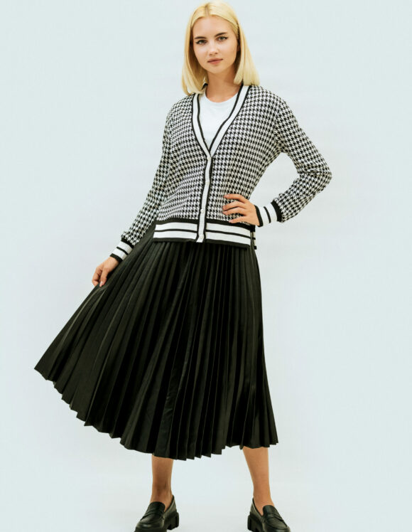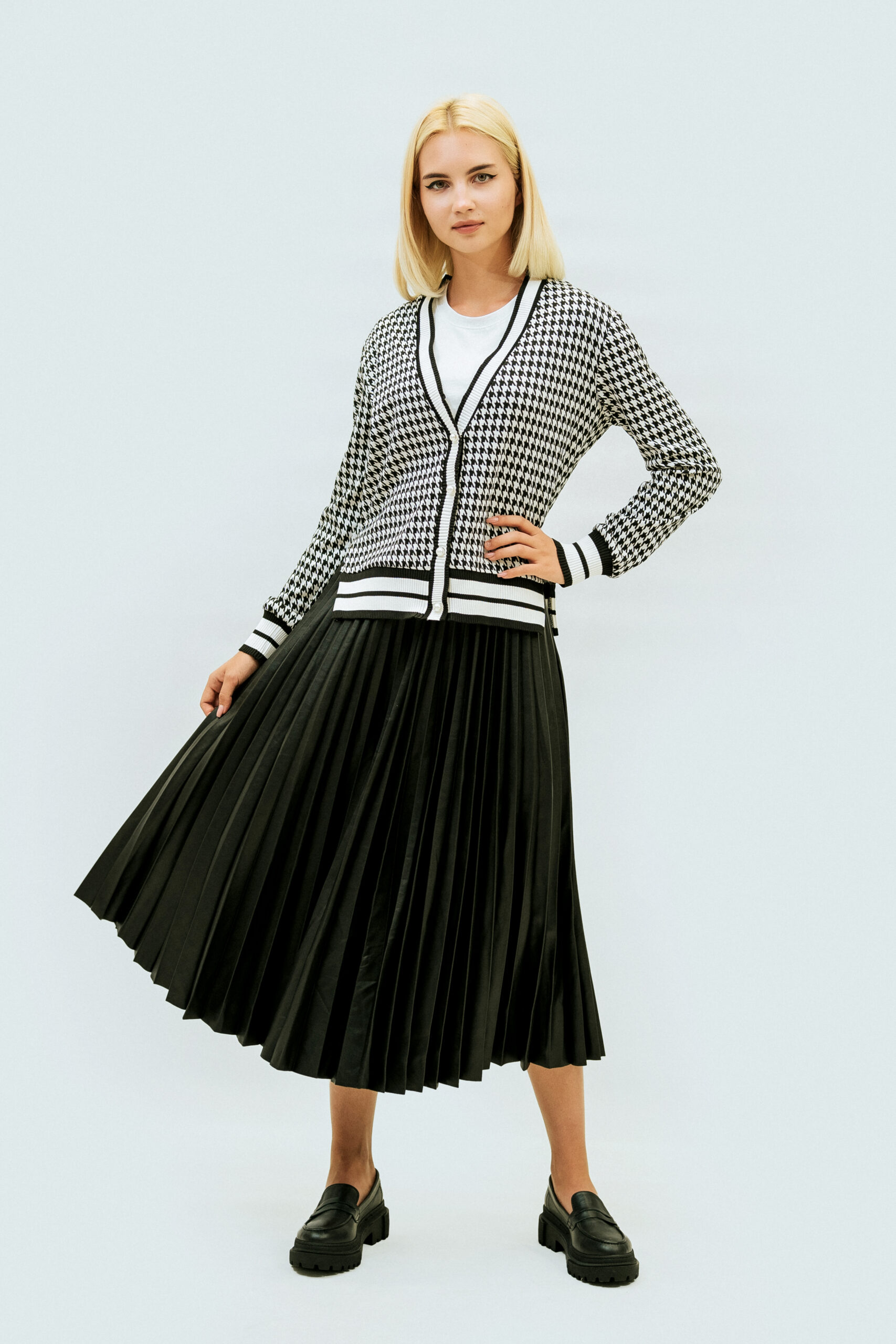 Костюм-двойка PHARDI Стиль: Классика Состав: 23% viscose 47% polyester 30% ryn 3% lycra Длина кардигана: 58 см Длина рукавов: 60 см Длина юбки: 83 см Сезон: осень-зима Цвет: черный Узор: гусиные лапки Застежка: кардиган на пуговицах, юбка на молнии Страна производства: Турция Артикул: 272646570