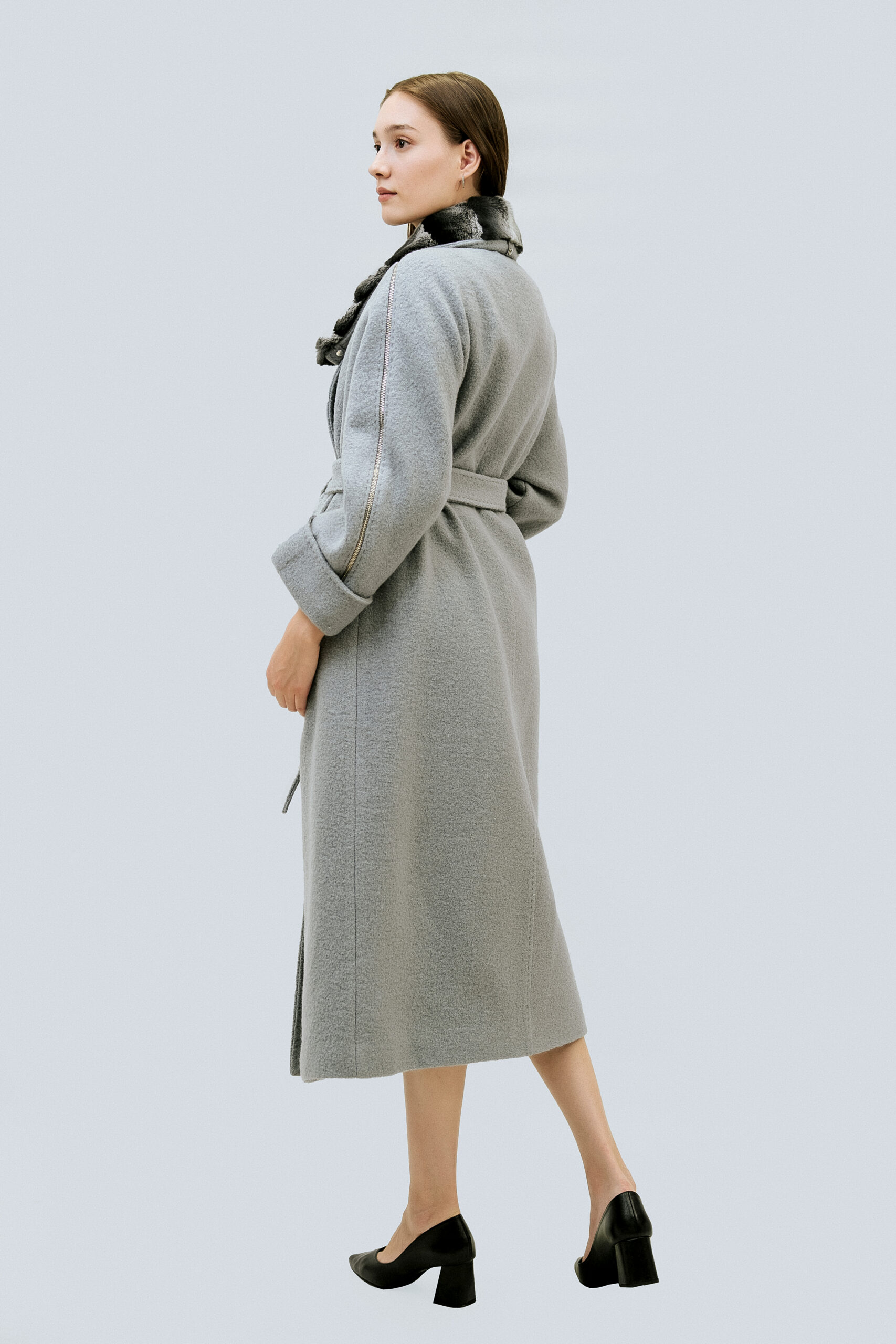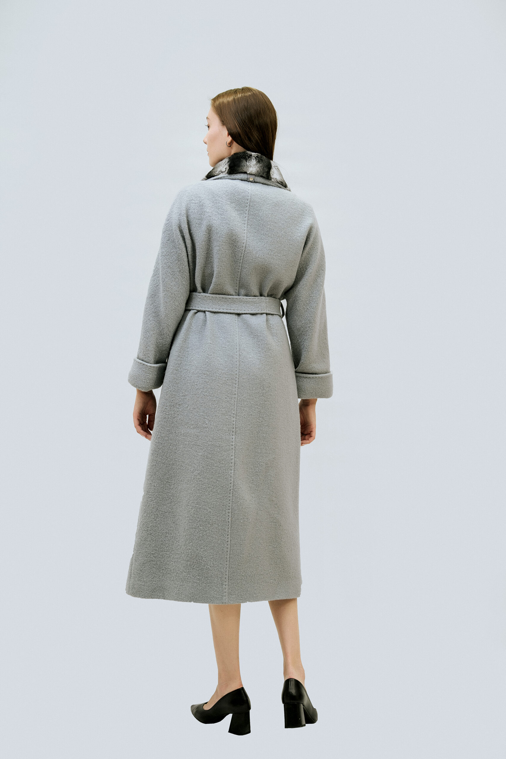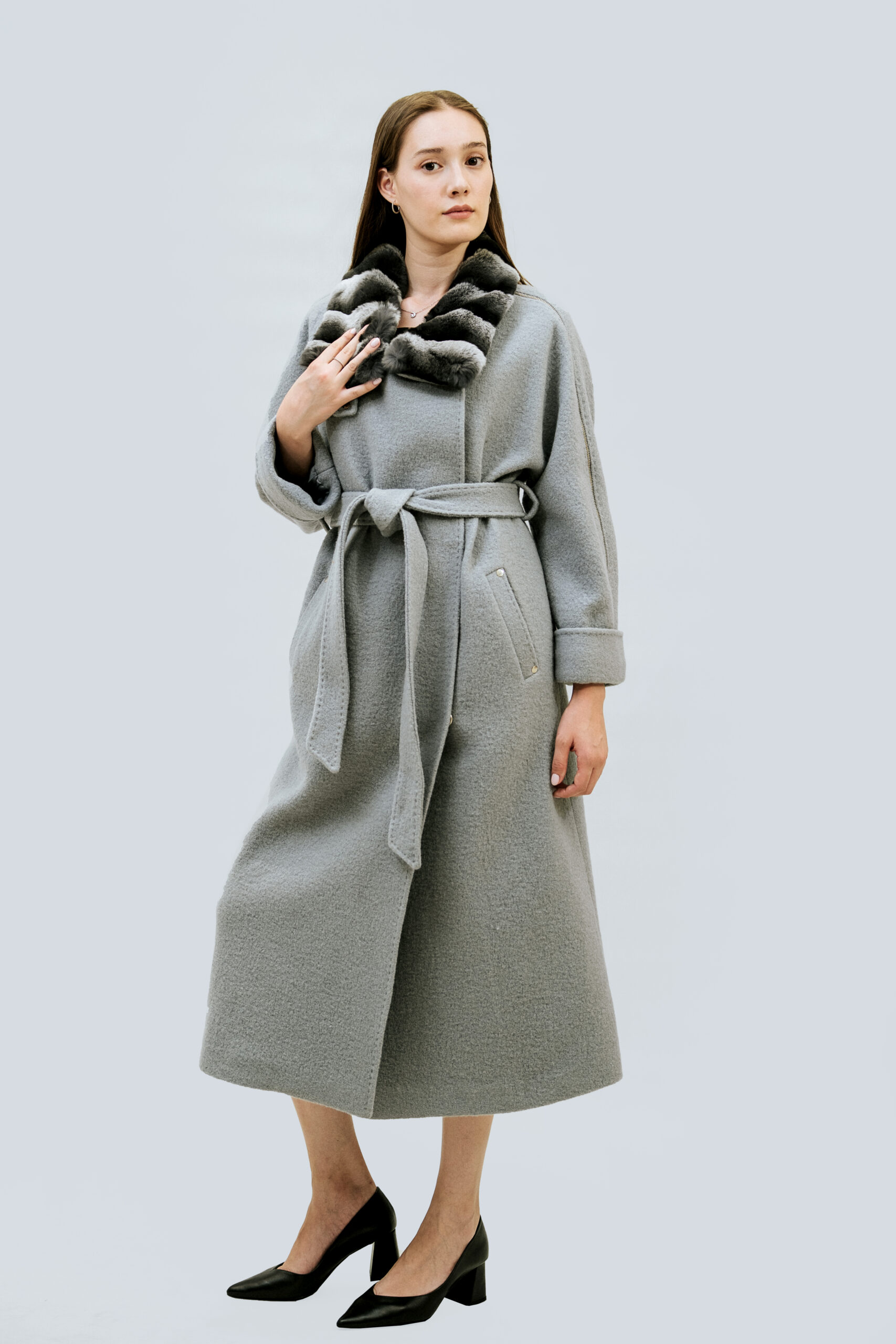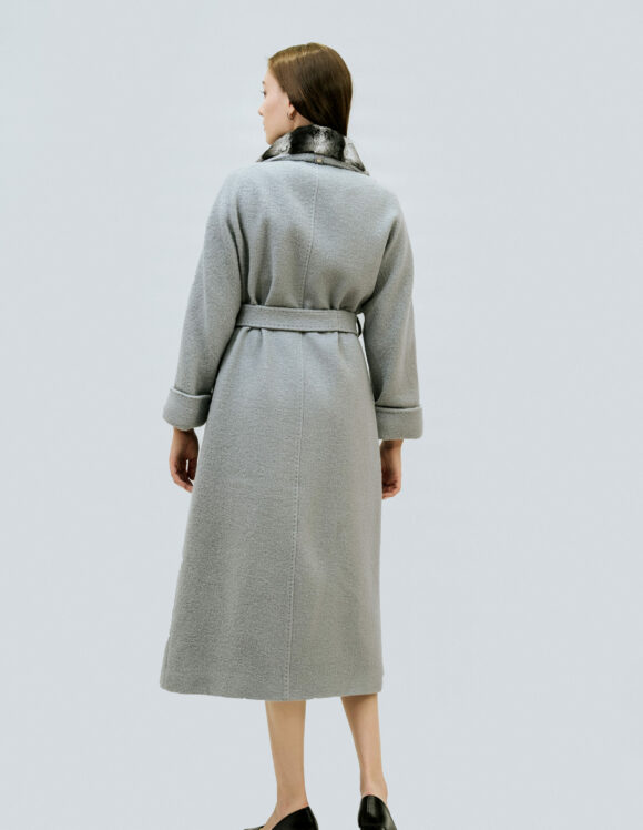 Пальто ESMERALDA Состав: шерсть Материал подклада: полиэстер Мех отделки: песец Длина изделия:120 см Длина рукава: 70 см Сезон: осень-зима Цвет: серый Страна производства: Турция Застежка: кнопки Артикул: 9591