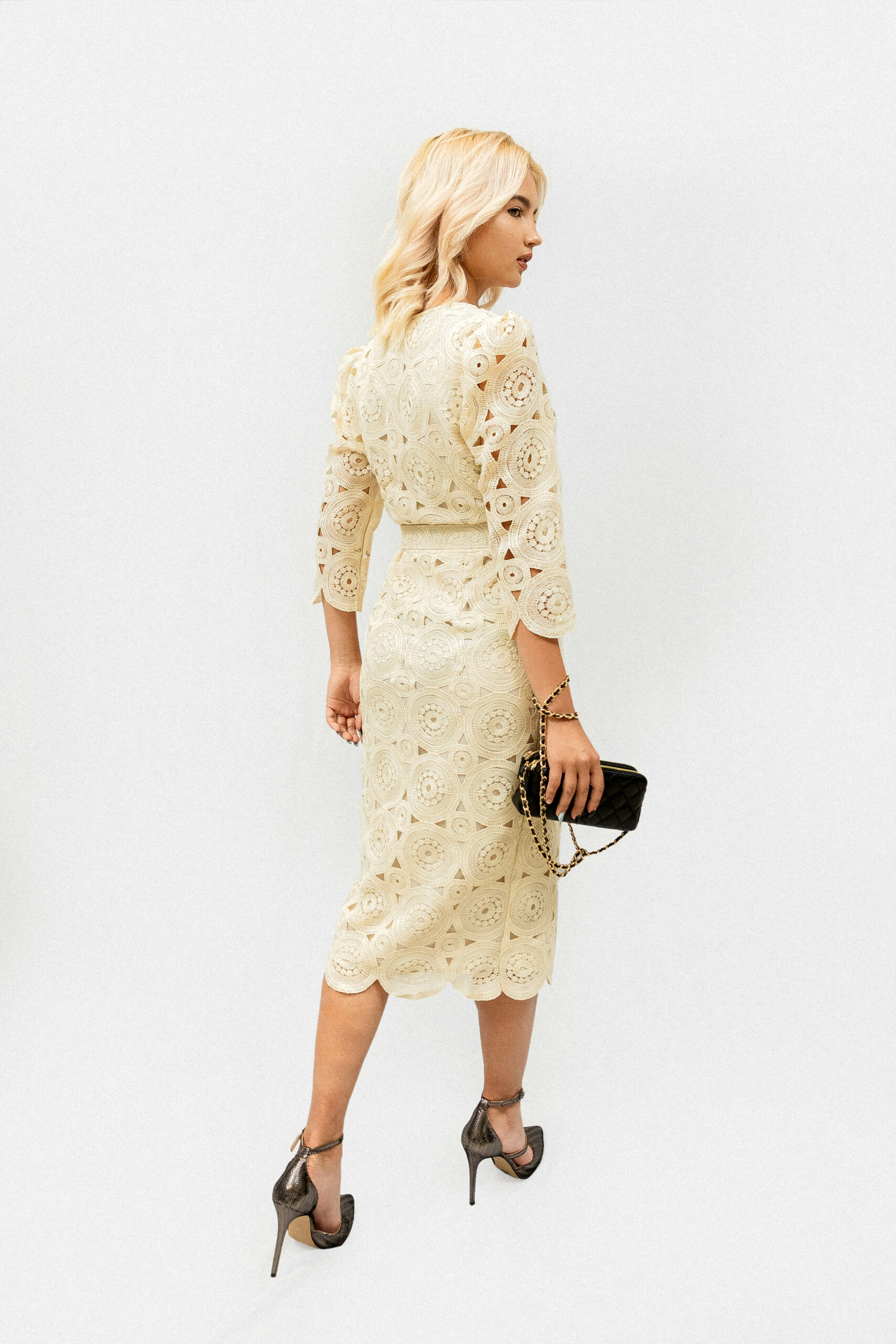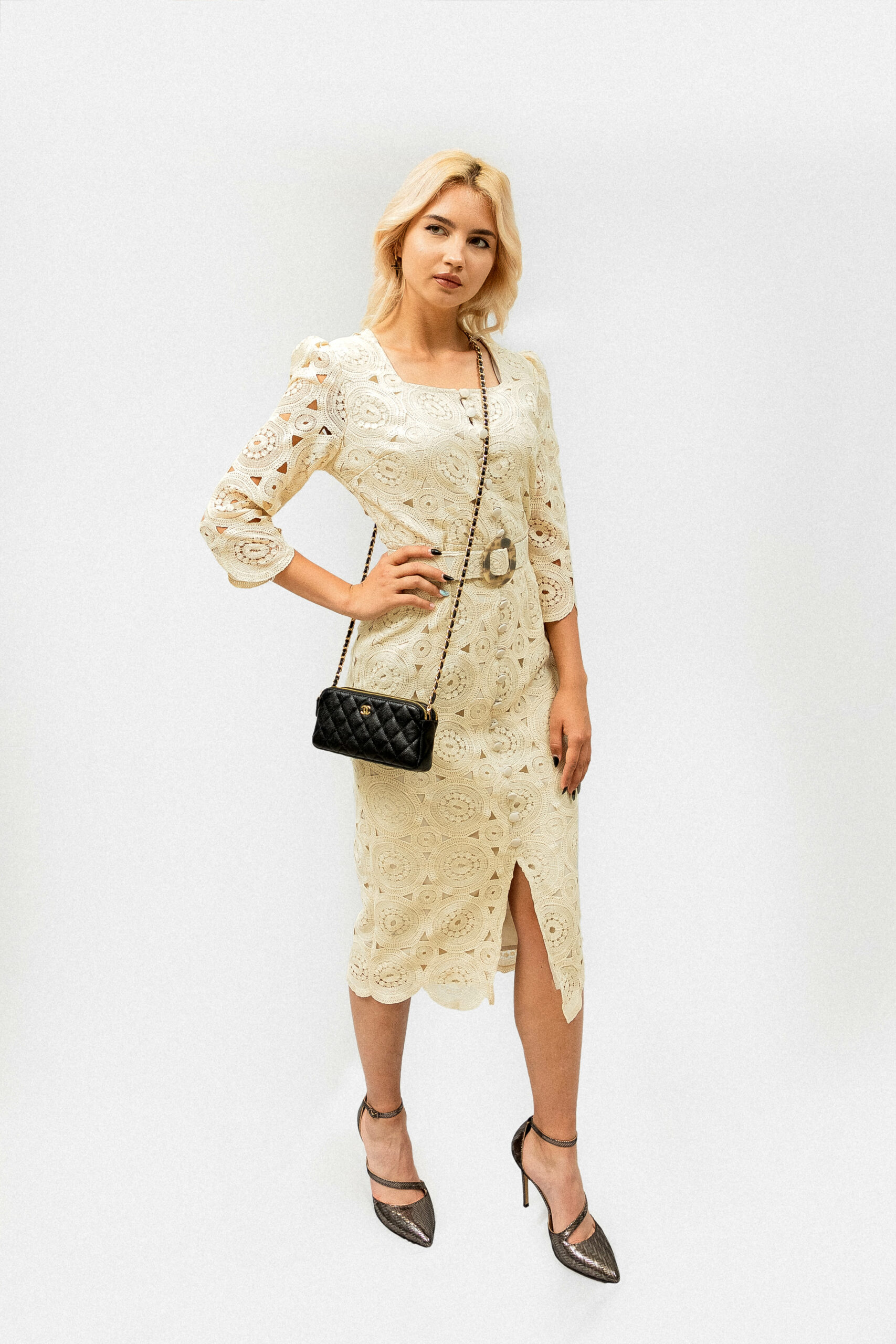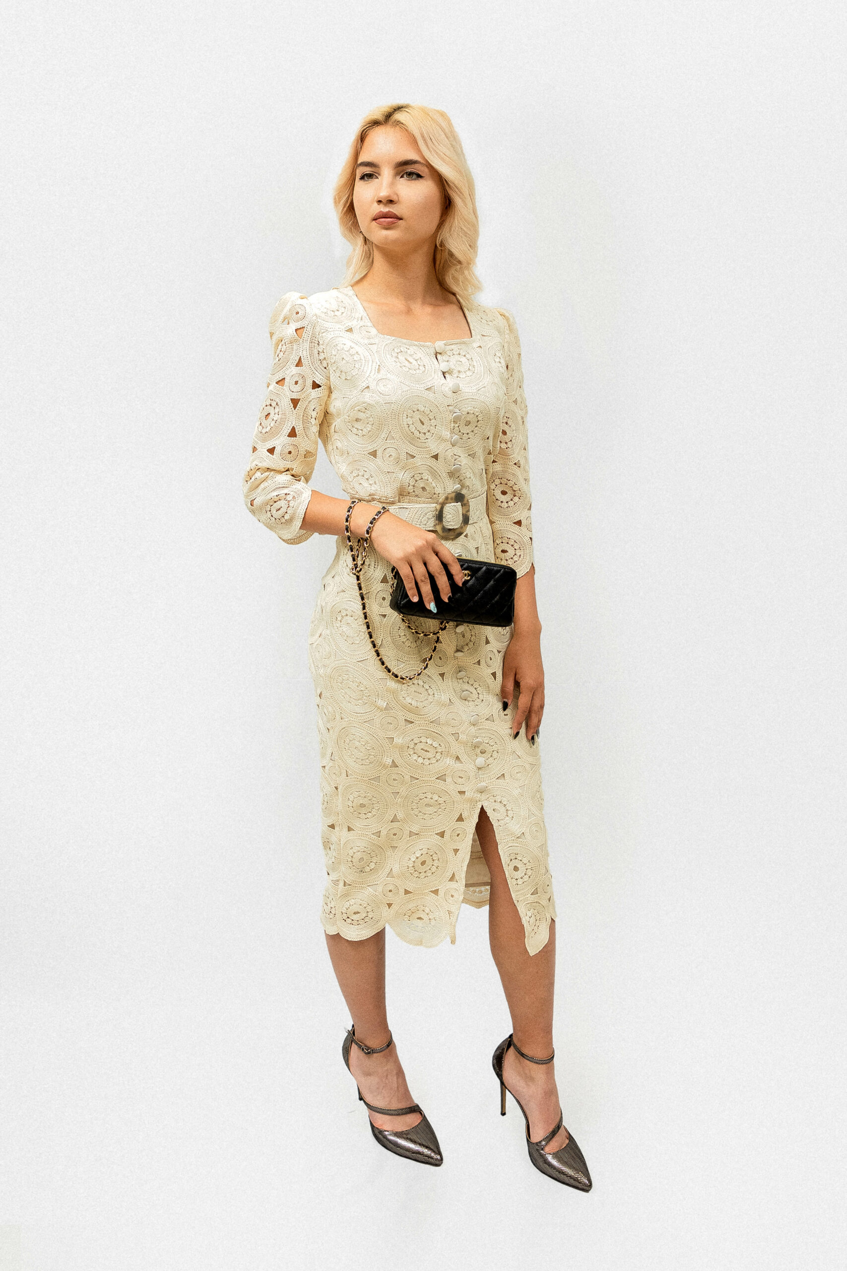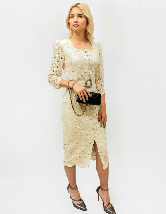 Платье:Бренд Lilium Стиль:Классика Состав:100% Полиэстер Размер товара на модели: 36 EUR Параметры модели: 85-62-89 Рост модели на фото: 170 Подходит на рост: 165-175 Длина: 115 см Размер рукав : 49 см Сезон: Демисезонная Цвет: Бежевый Узор: Однотонное,Плетенье кроше! Гарантийный период: не установлен Страна производства: Турция Застежка: спереди на пуговицах с поясом