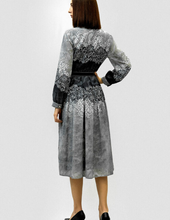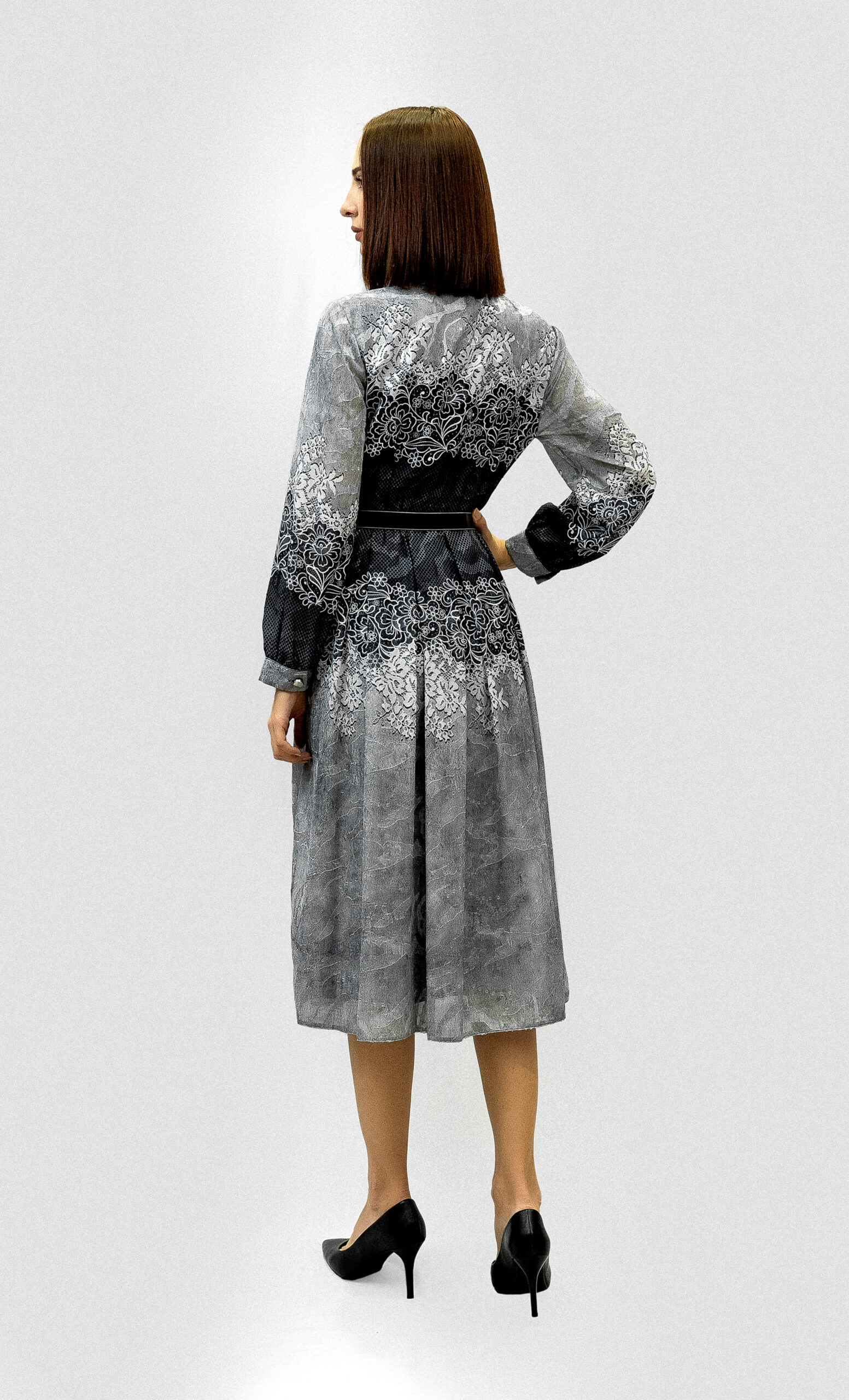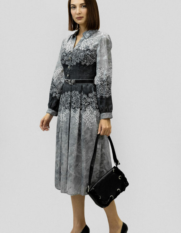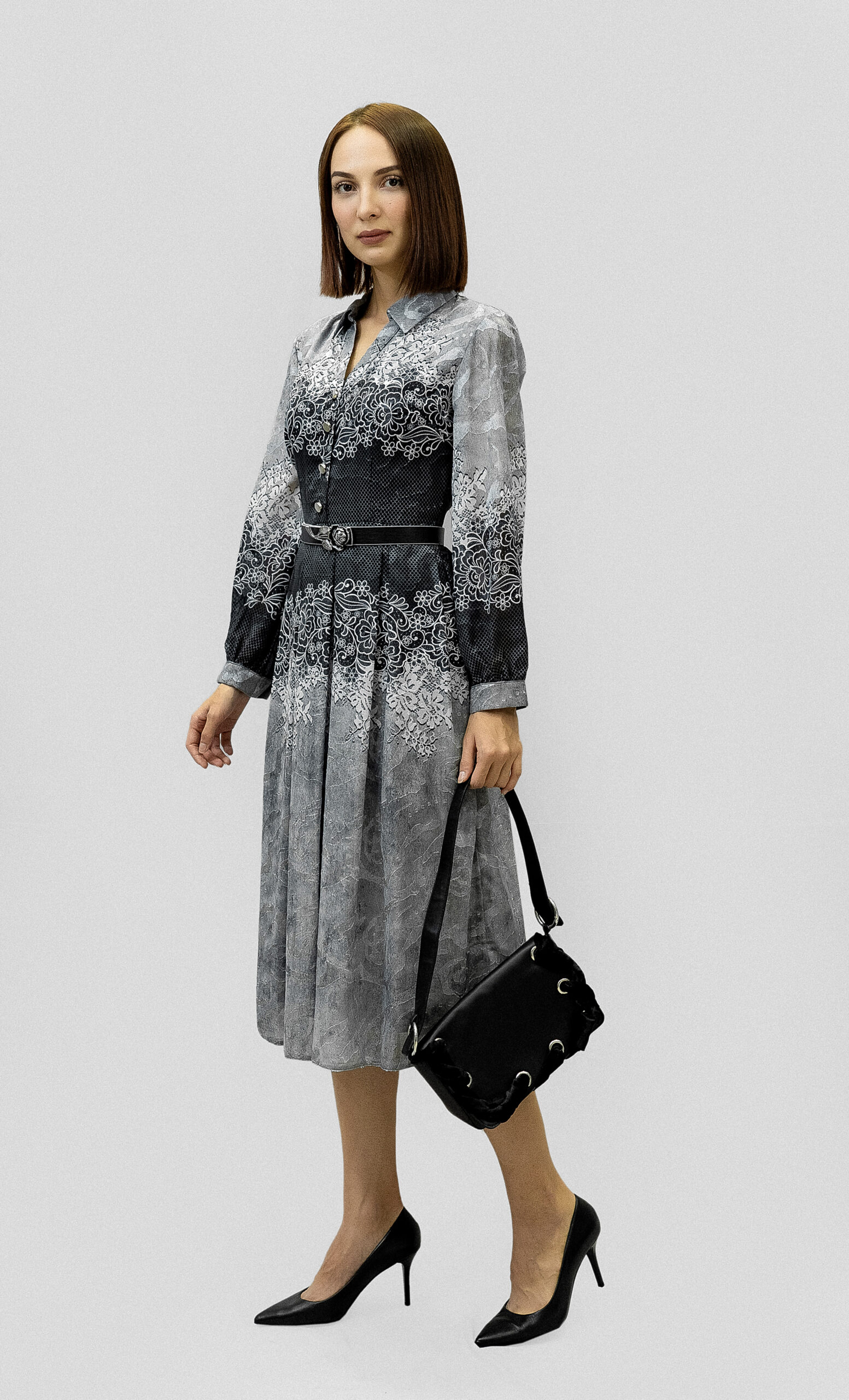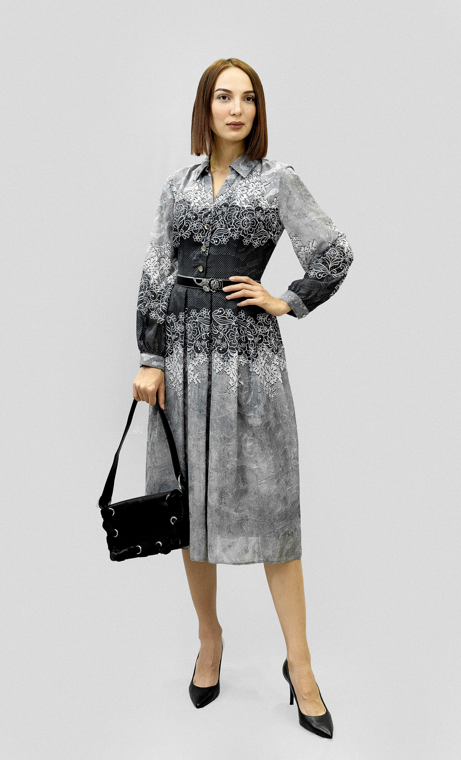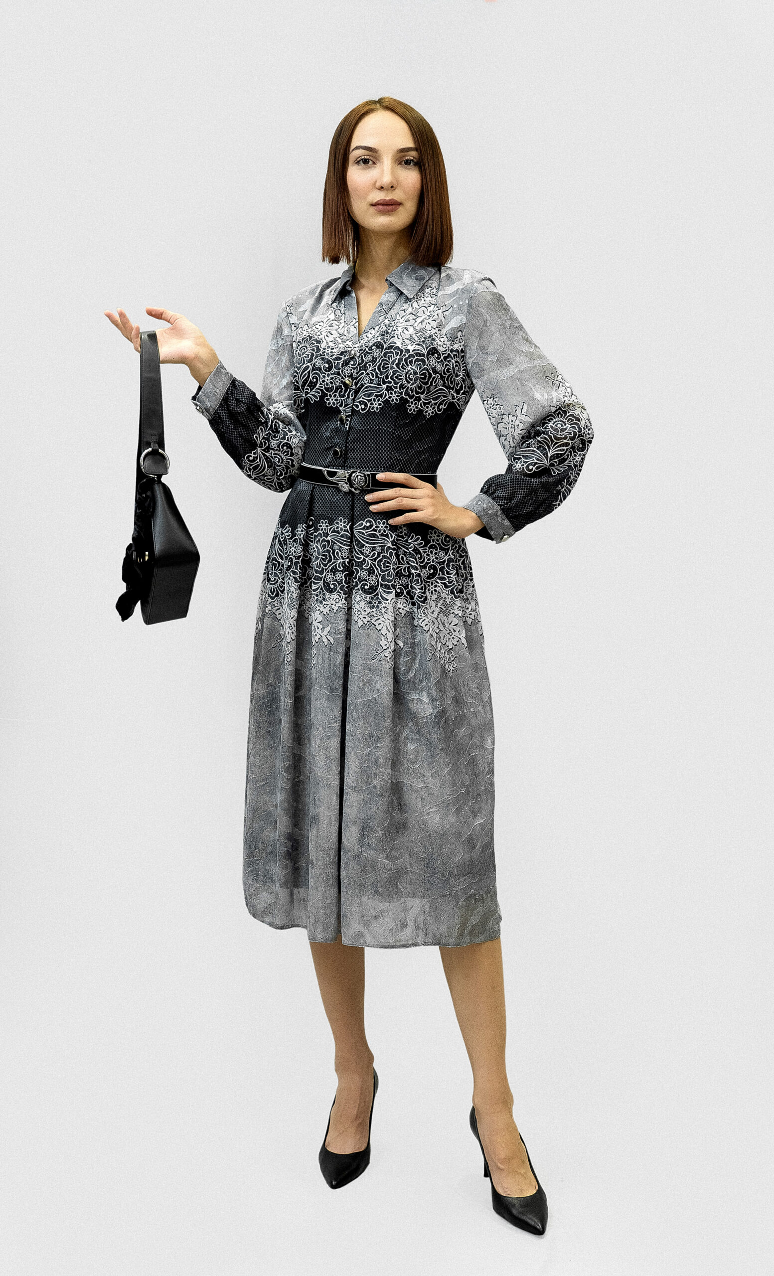 Платье LADY FORM Стиль: Кэжуал Состав : 100% Polyester Длина: 113 см Длина рукавов: 57 см Сезон: демисезонный Цвет : серый Узор : цветы Застежка: молния, цветы Артикул: 9003