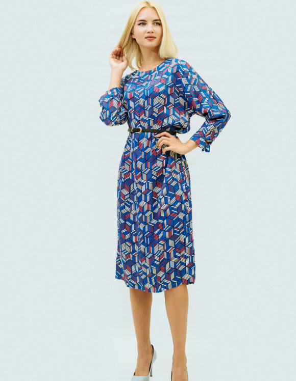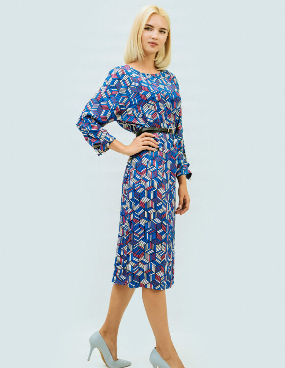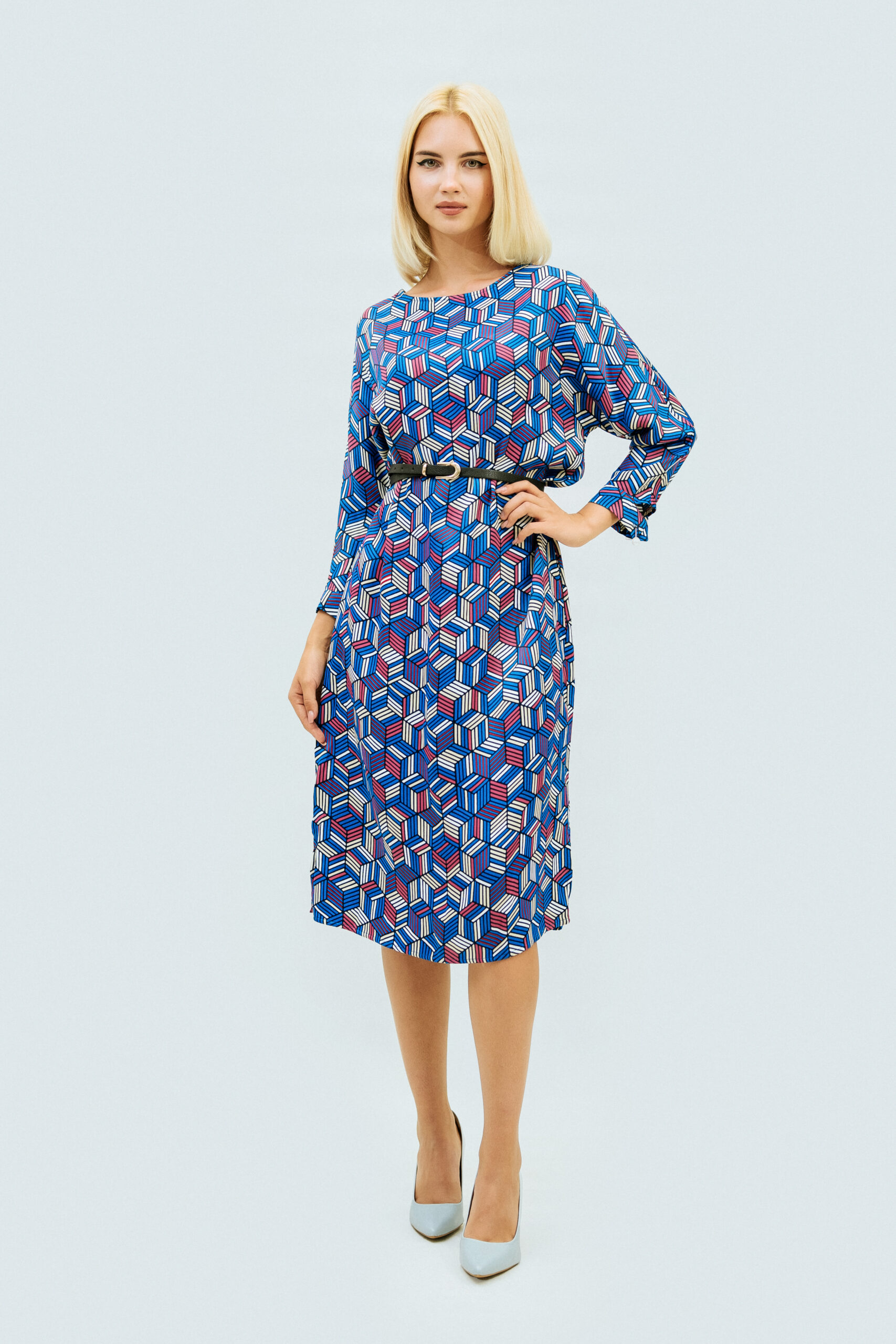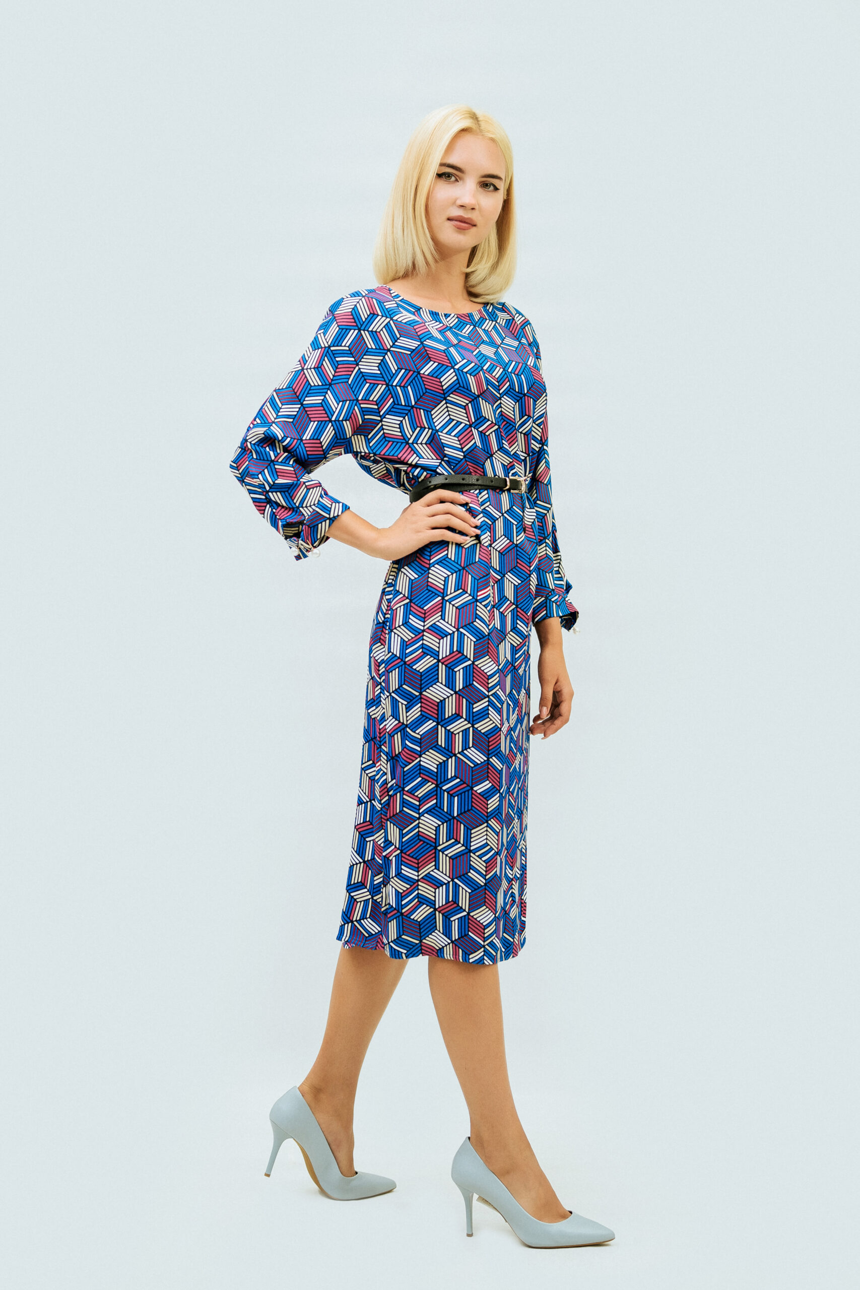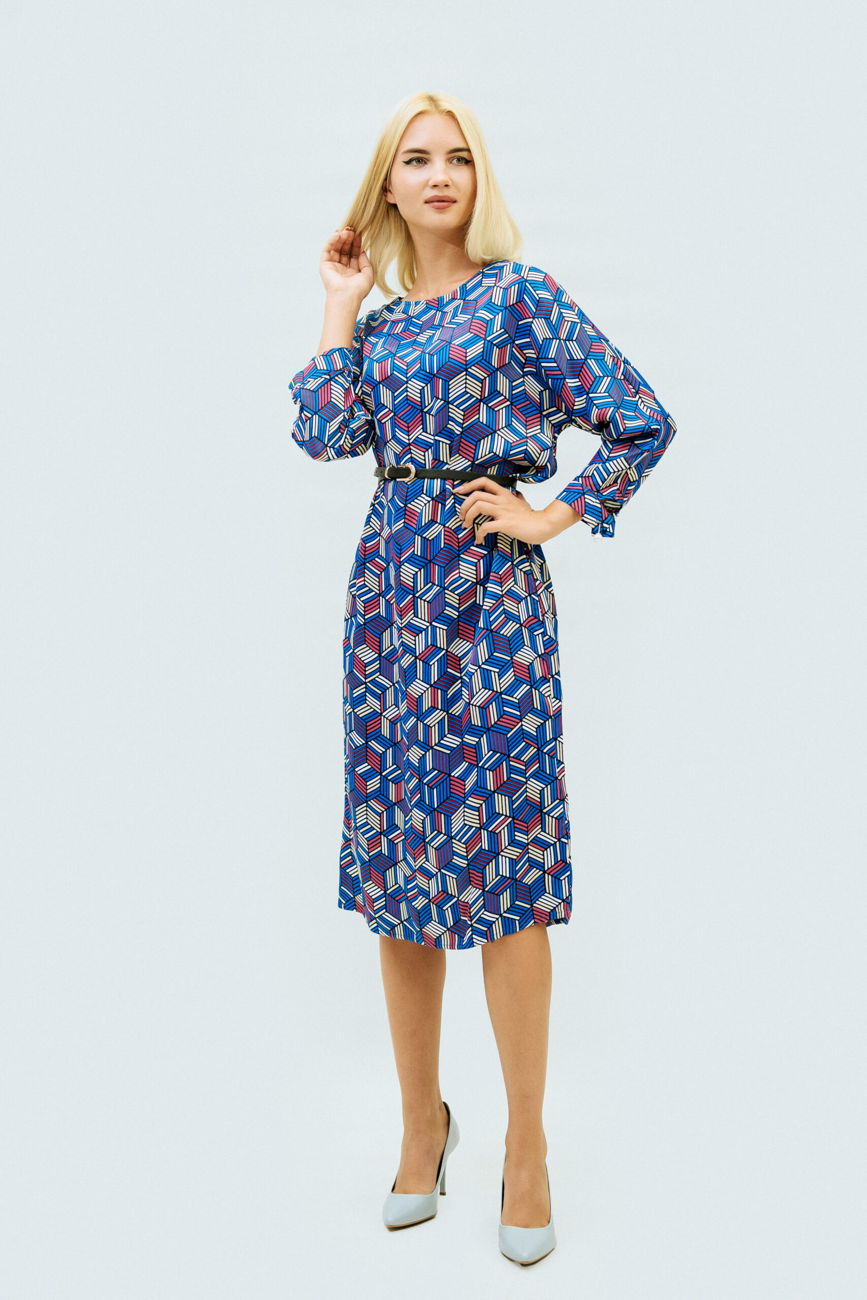 Платье PIENA Стиль: Кэжуал, полуклассика Состав: 100% viscon Длина: 106 см Длина рукава: 46 см Сезон: демисезонный Цвет: синий Узор: геометрический узор Застежка: сбоку на молнии, сзади на пуговице Страна производства: Турция Артикул: 23PK6340