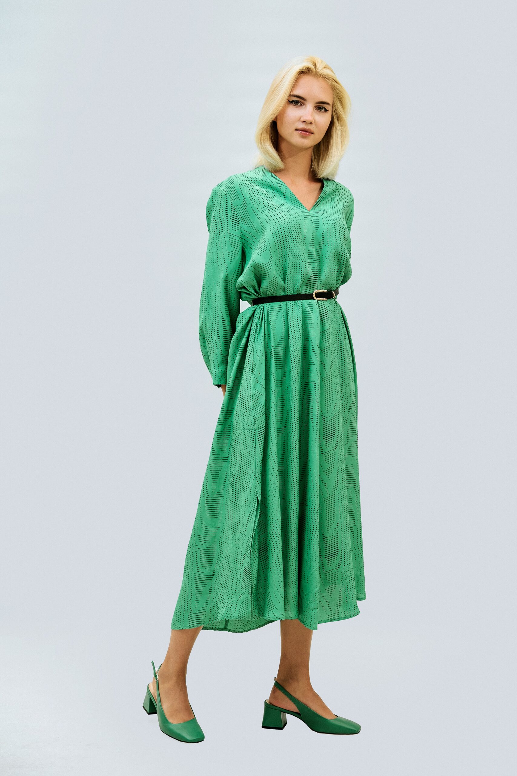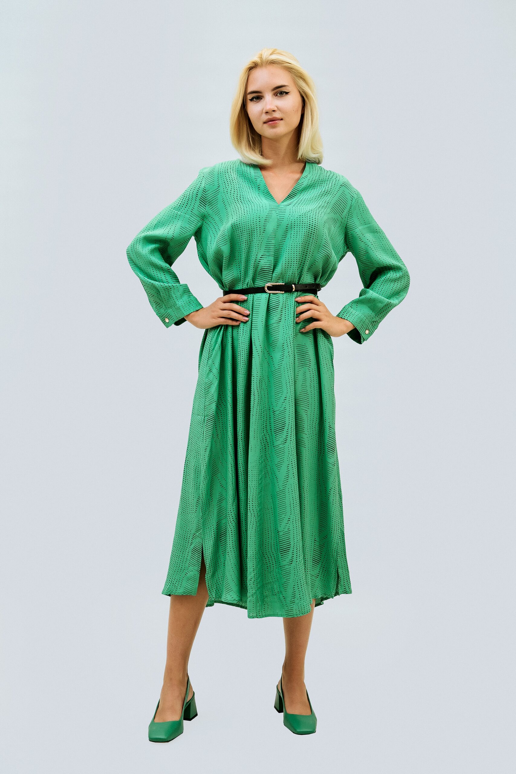 Платье PIENA Стиль: Кэжуал Состав: 100% viscon Длина: 126 см Длина рукава: 54 см Сезон: демисезонный Цвет: зеленый Узор: геометрические фигуры Застежка: нет Страна производства: Турция Артикул: 23PK6304