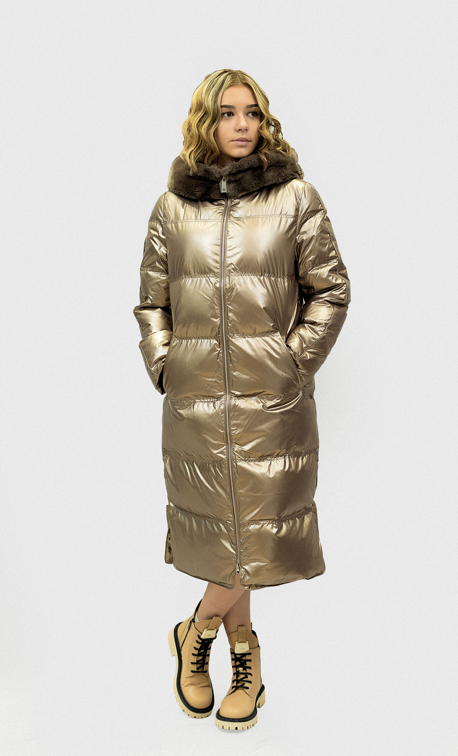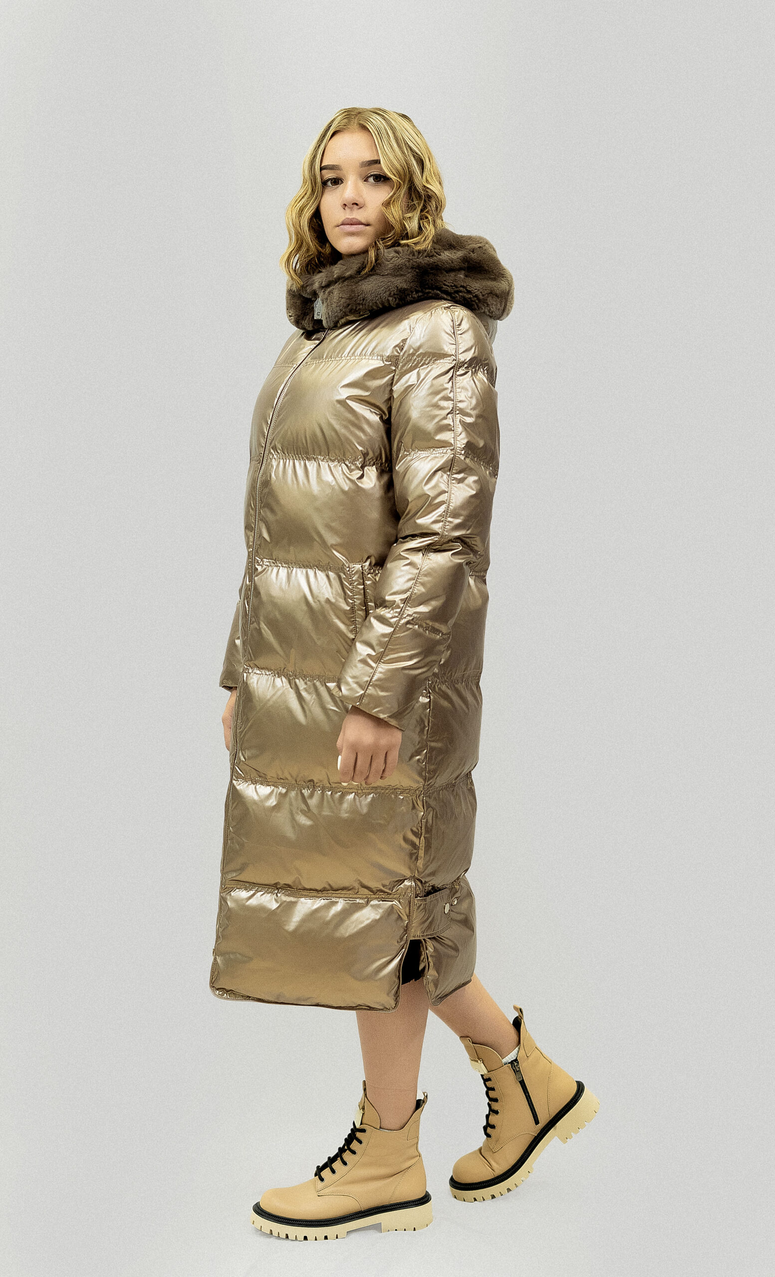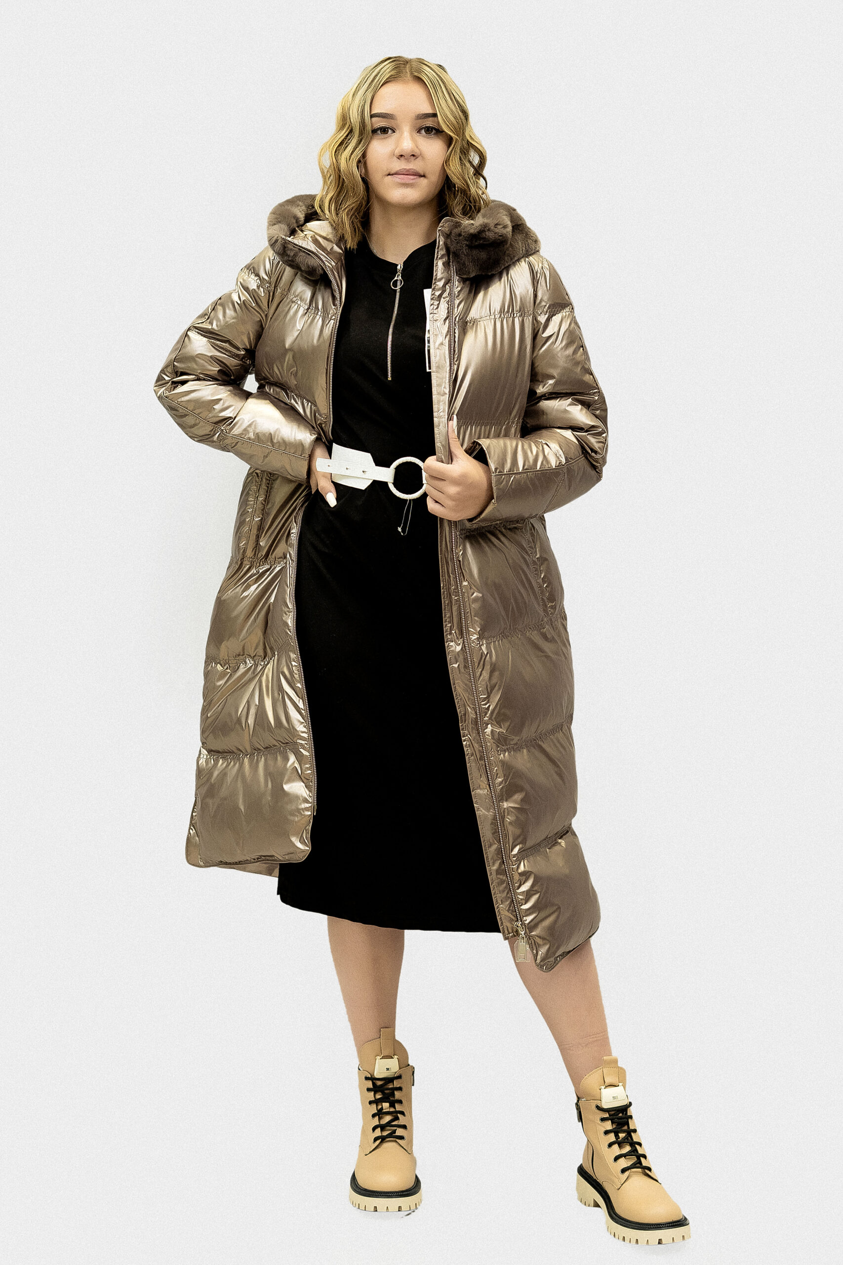 Пуховик SOLLO Состав верха: таслан Материал подклада: полиэстер Материал утеплителя: био-пух Мех отделки: кролик Длина рукава: 62 см Длина изделия: 104 см Сезон: осень-зима Цвет: бронза Страна производства: Турция Застежка: металлическая молния Артикул: 2118