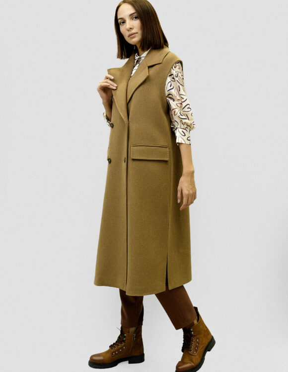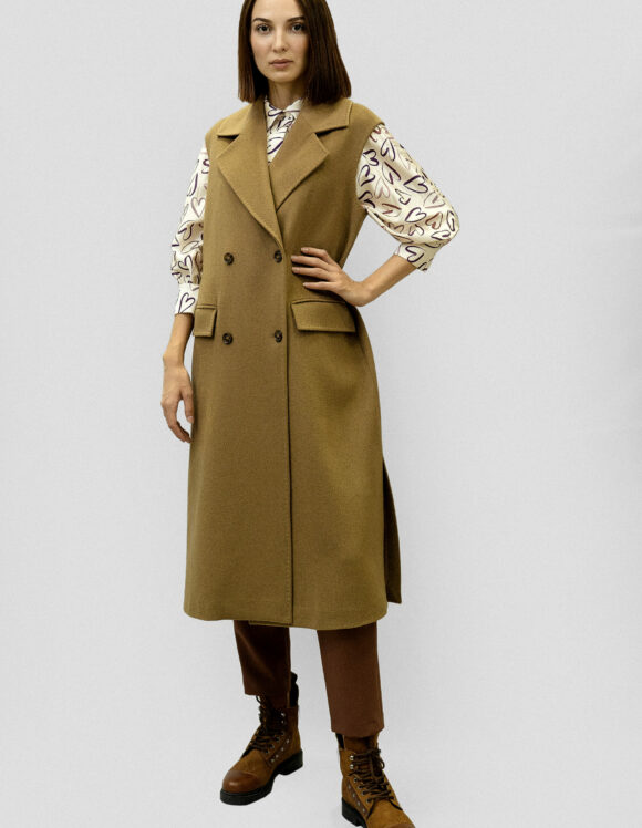 Жилетка ESMERALDA Состав верха: ткань: кашемир и шерсть Материал подклада: полиэстер Длина: 110 см Сезон: демисезонный Цвет: бежевый Страна производства: Турция Застежка: пуговицы Артикул: 9372