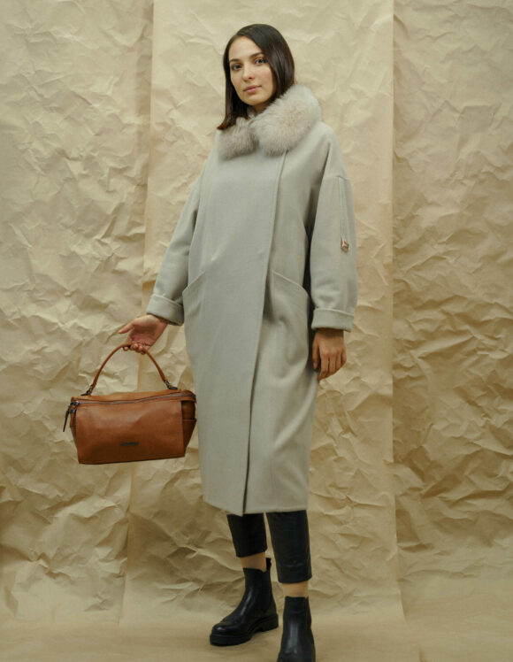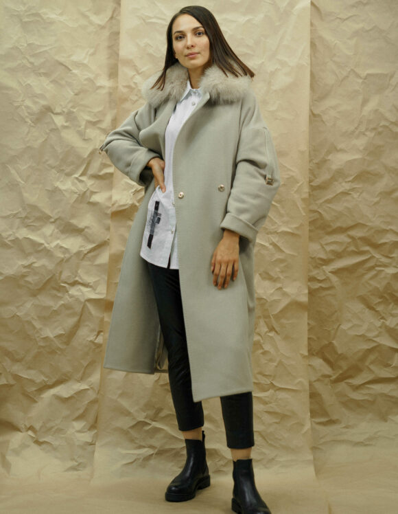 Пальто ESMERALDA Состав: шерсть Материал подклада: полиэстер Мех отделки: песец Длина изделия:120 см Длина рукава: 70 см Сезон: осень-зима Цвет: серый Страна производства: Турция Застежка: кнопки Артикул: 9591