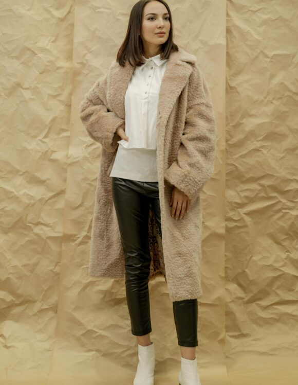 Шуба-тедди SOLLO Состав верха: овечья шерсть Материал подклада: тонкая прослойка био-пуха Длина: 80 см Длина рукава от горловины: 74 см Сезон: осень-зима Цвет: бежевый Страна производства: Турция Застежка: металлическая молния